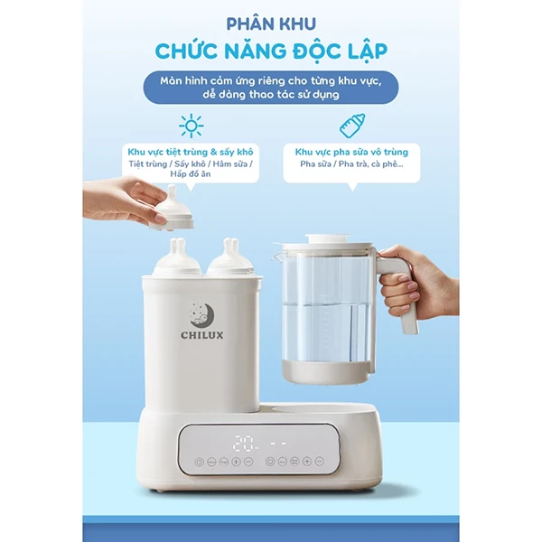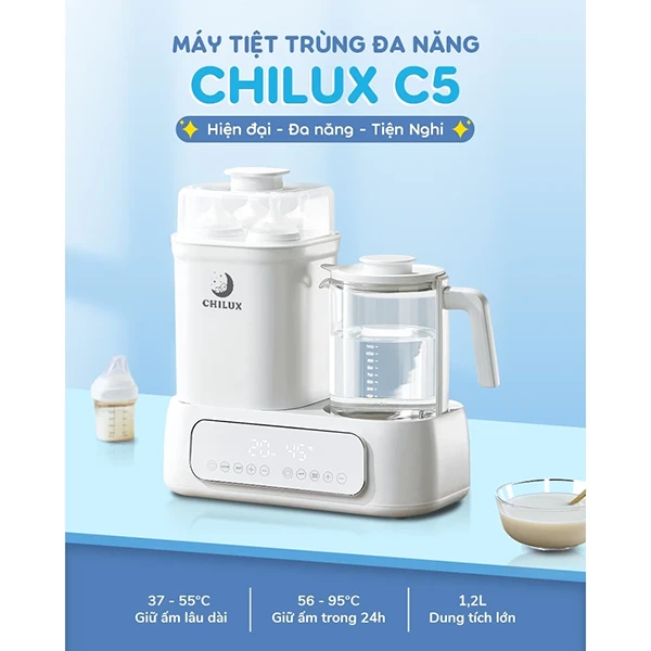 Trong những năm tháng đầu đời, vệ sinh bình sữa, tiệt trùng và hâm sữa đúng cách là yếu tố quan trọng quyết định đến sức khỏe và sự phát triển của trẻ nhỏ. Hiểu được điều đó, Chilux đã cho ra đời Máy Tiệt Trùng – Sấy Khô – Hâm Sữa C5, tích hợp 3 chức năng trong 1 thiết bị, giúp mẹ chăm con khoa học, tiết kiệm thời gian mà vẫn đảm bảo an toàn tuyệt đối.